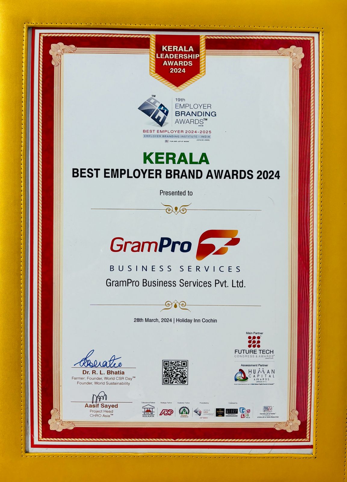 GramPro Business Services Pvt. Ltd. has been honoured with the Kerala Best Employer Brand Awards 2024 by the World HRD Congress & Employer Branding Awards.